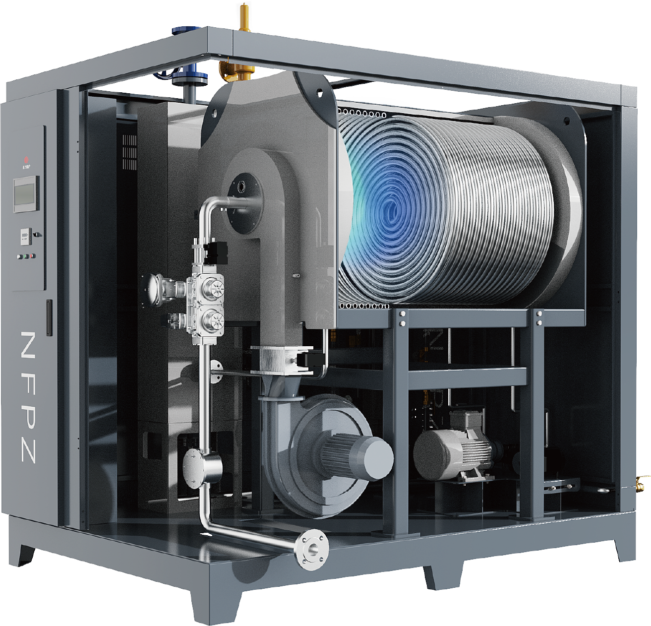 采用盘管式强制循环直流蒸汽发生技术,相较传统蒸汽锅炉30分钟左右的预热时间,2-3分钟即可产生满足用户需求的高温高压蒸汽,可节省约90%启动能耗;且设备相较同类型即速出热设备,热效率更高,蒸汽品质更好。